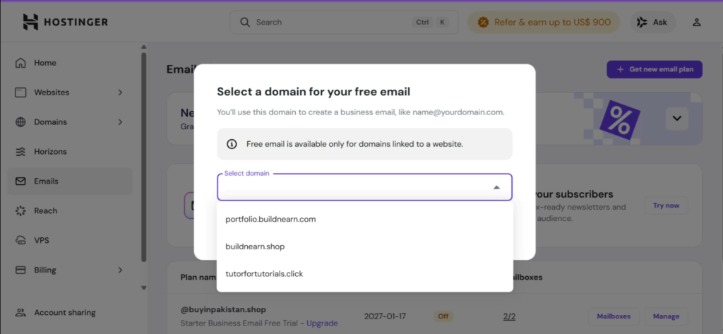 Important: Hostinger only allows you to claim a free business email for domains that already have an active website.