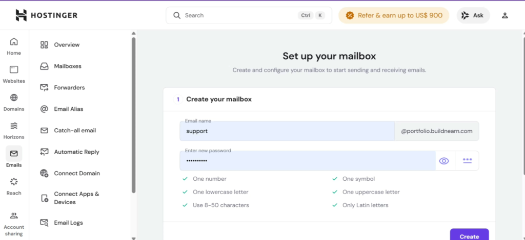 Creating a free business email on Hostinger is simple and only takes a few minutes — as long as your domain has an active website connected.