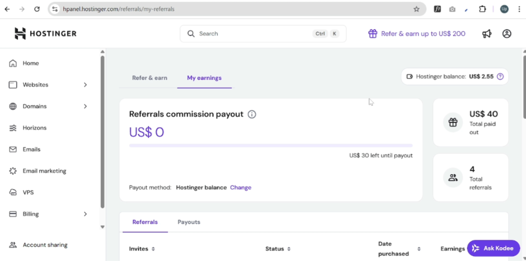 Here, you will see your available affiliate balance. In my case, I currently have $2.55 USD. Hostinger allows you to claim your earnings once you reach $30. Previously, I transferred larger amounts (such as $40 or $50) into my Hostinger balance.