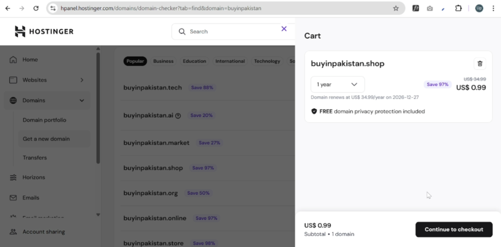 Now, search for your desired domain name. I pasted a domain name and searched for it. I decided to choose a .shop extension. Hostinger was offering a 97% discount, meaning the domain cost around $0.99 for the first year, with renewal at approximately $35 per year.