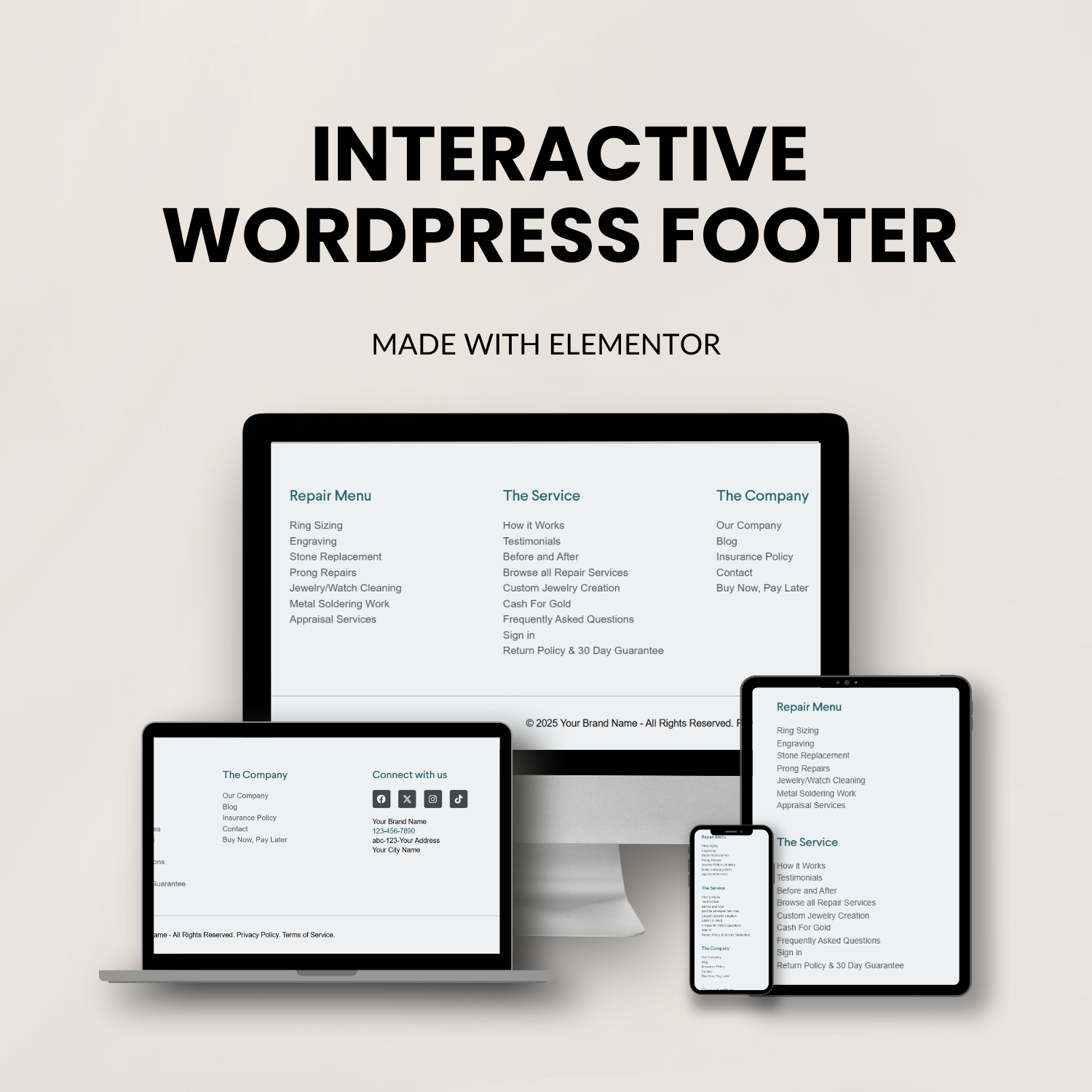 Add a touch of professionalism to your business’s website with this contemporary responsive footer template, which was designed entirely in Elementor. This footer layout is clean, functional, and fully customizable, making it an excellent choice for business, agency, or personal websites.